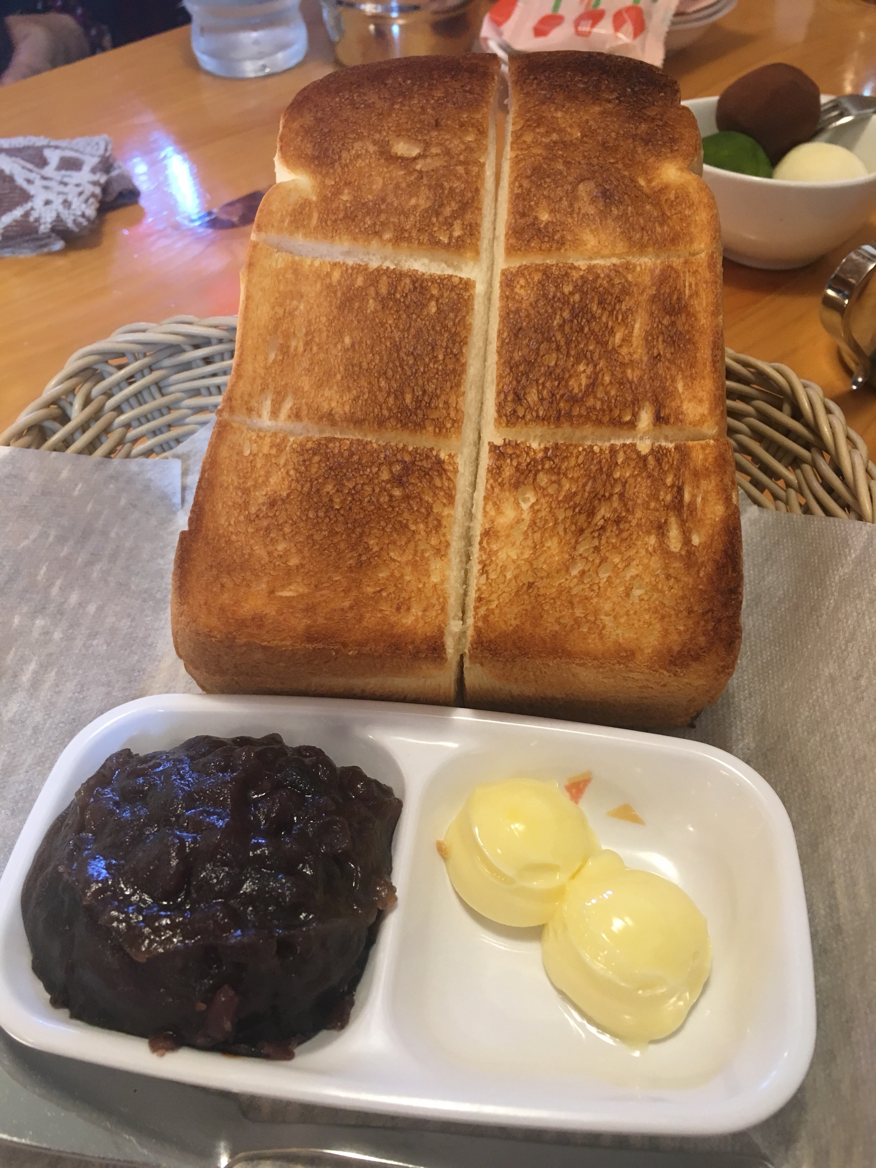 この厚切りトーストにバターとあんこをたっぷりのせて、アゴが外れそうになりながらかじるのが美味いんですよね(^-^)