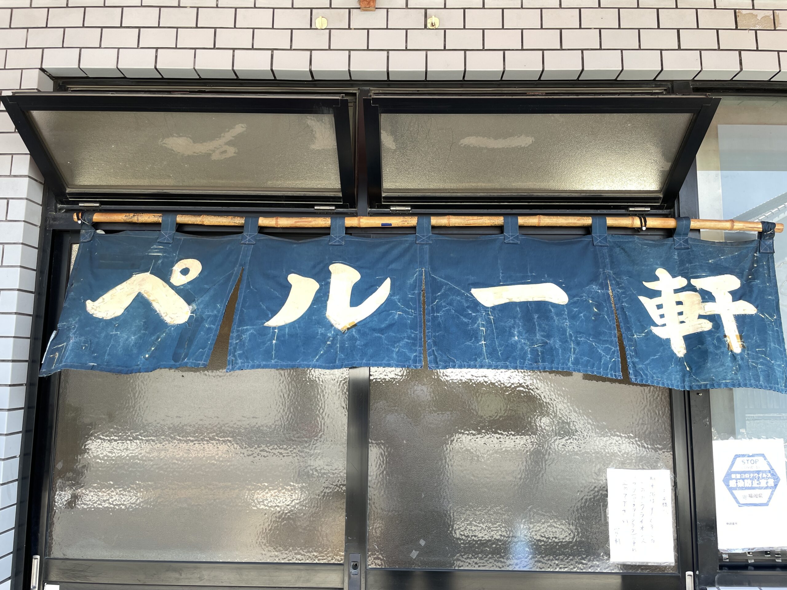 お店は白いタイル地のビルの1階にあり、青い暖簾に白字でペルー軒と書かれています。