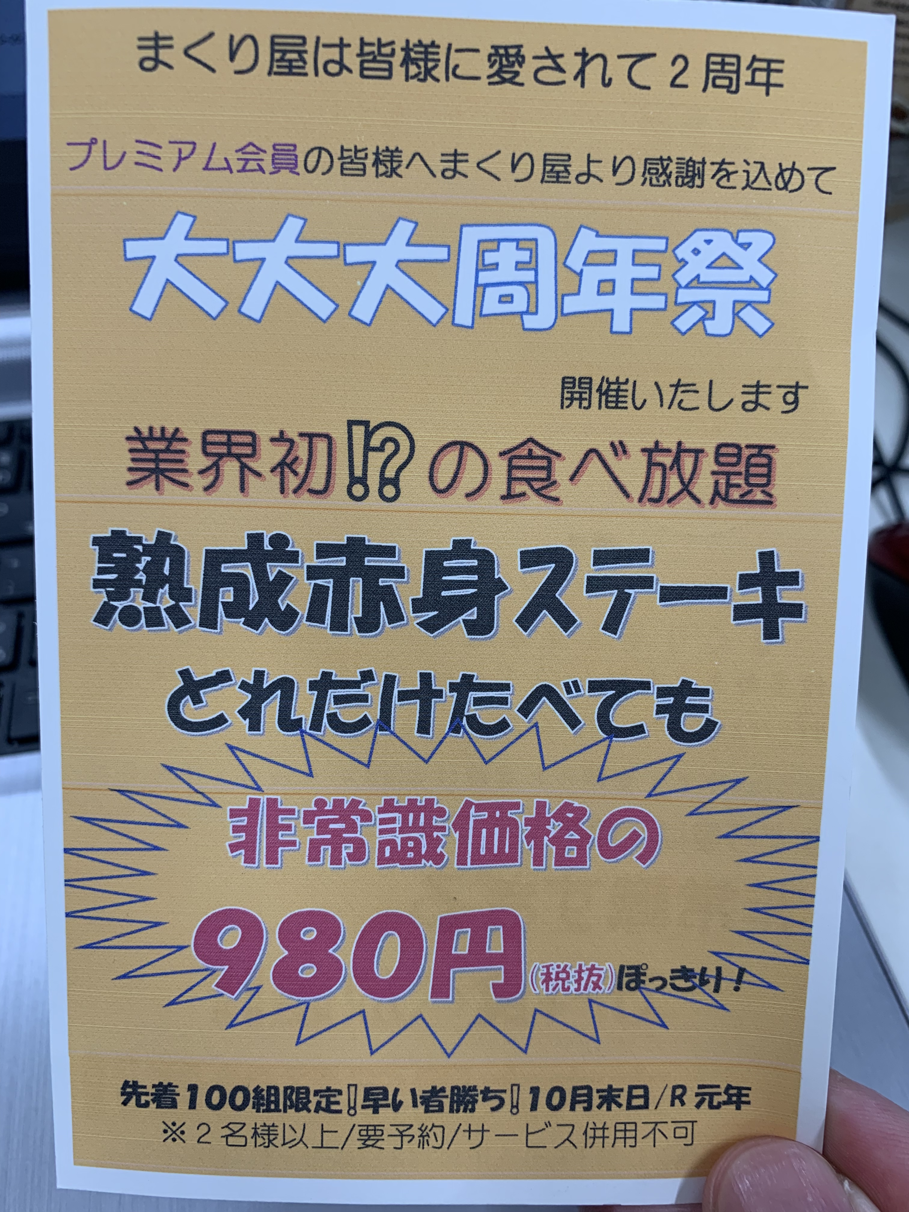 まくり屋志免本店で前回、唐揚げ食べ放題を堪能しましたが、またしても周年記念イベントのお葉書が届きました。