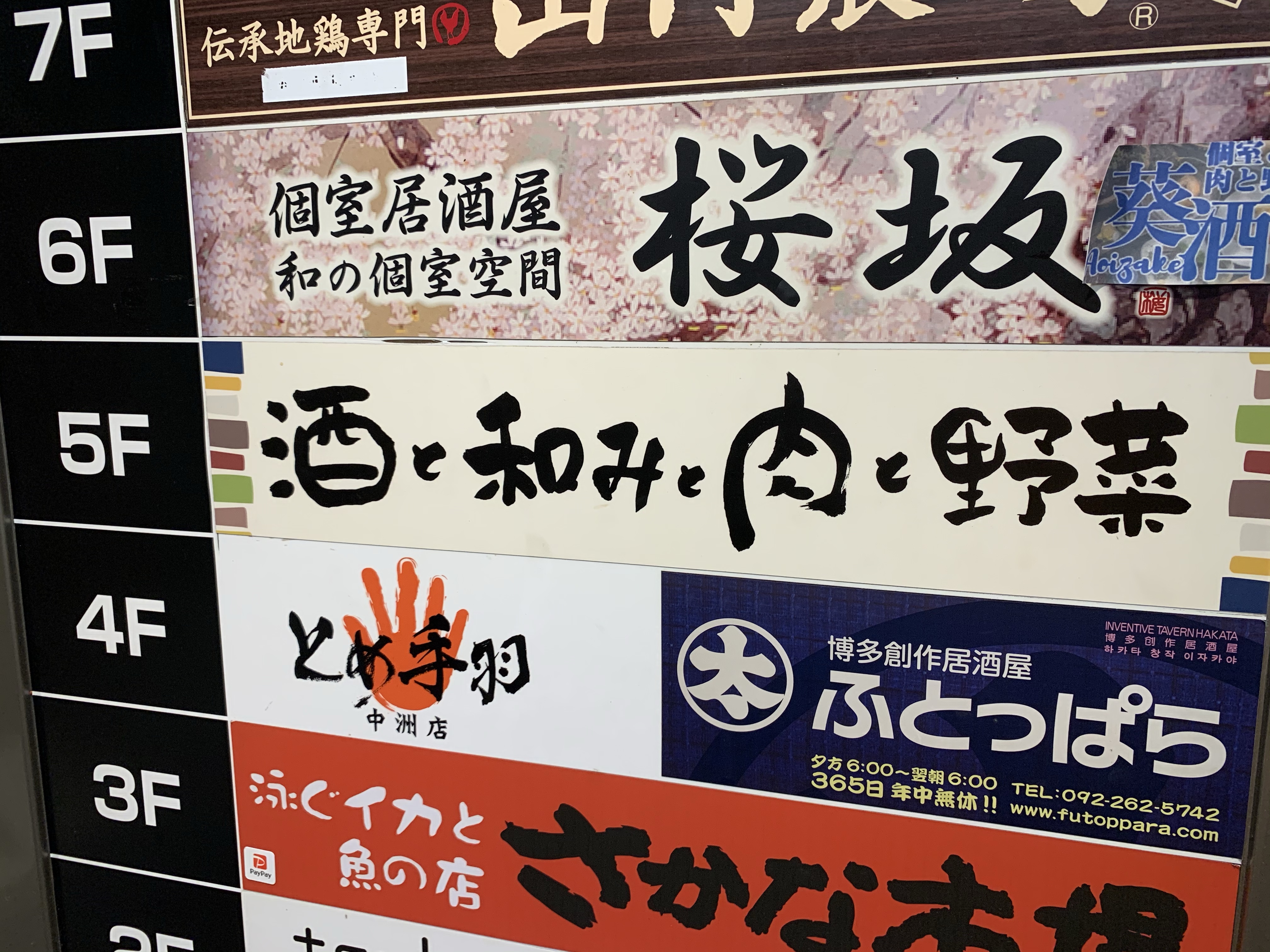 宗像市から唐揚げ屋さんを経由して、中州の酒と和みと肉と野菜(なぜかまんまる鶏という店名も書いてある)に伺いました。