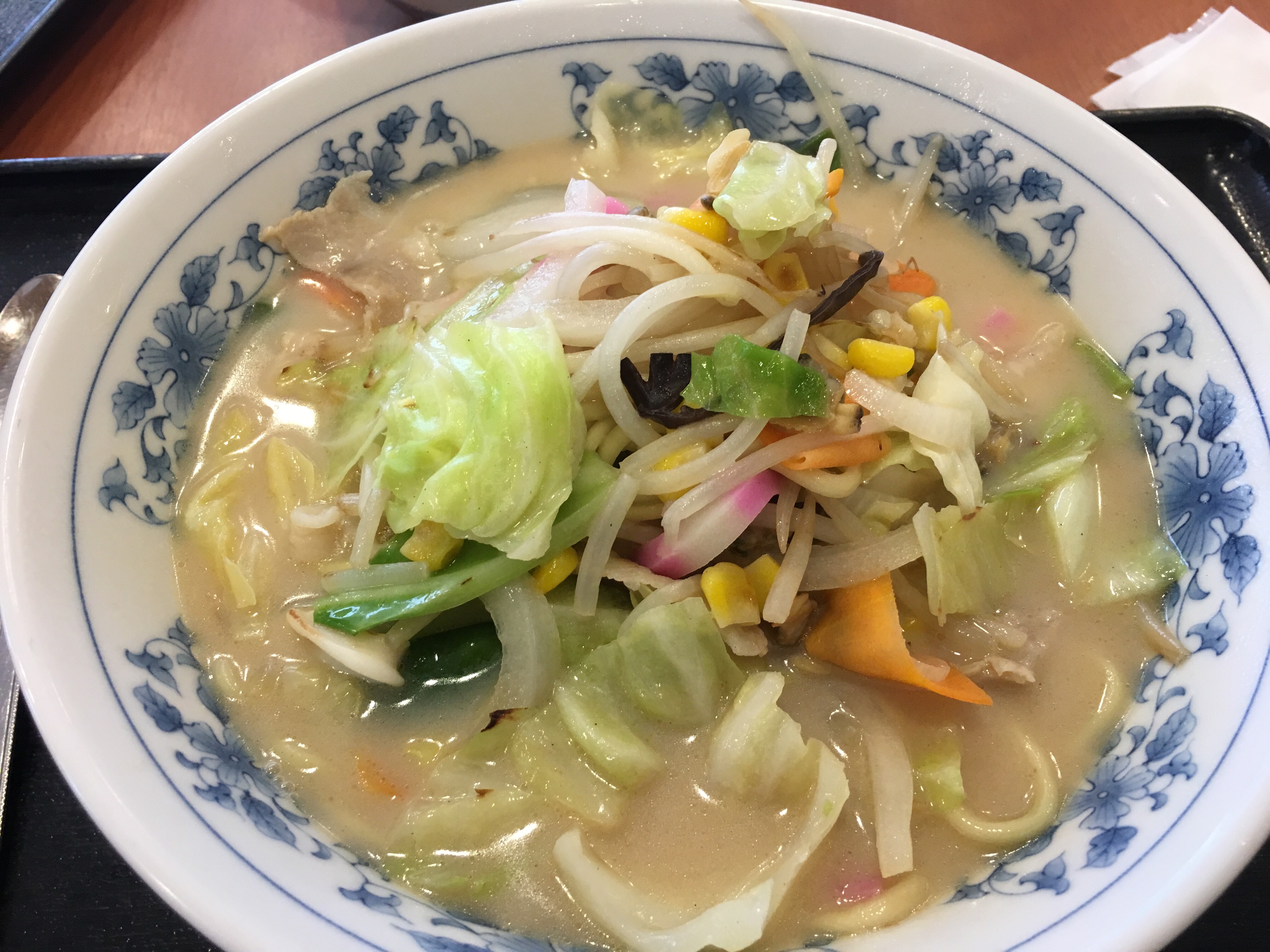 ちゃんぽんは野菜に豚肉だけでなく、イカやエビ、アサリなどの海鮮もしっかり入っていて、スープもクリーミーでなかなかに美味しいです。