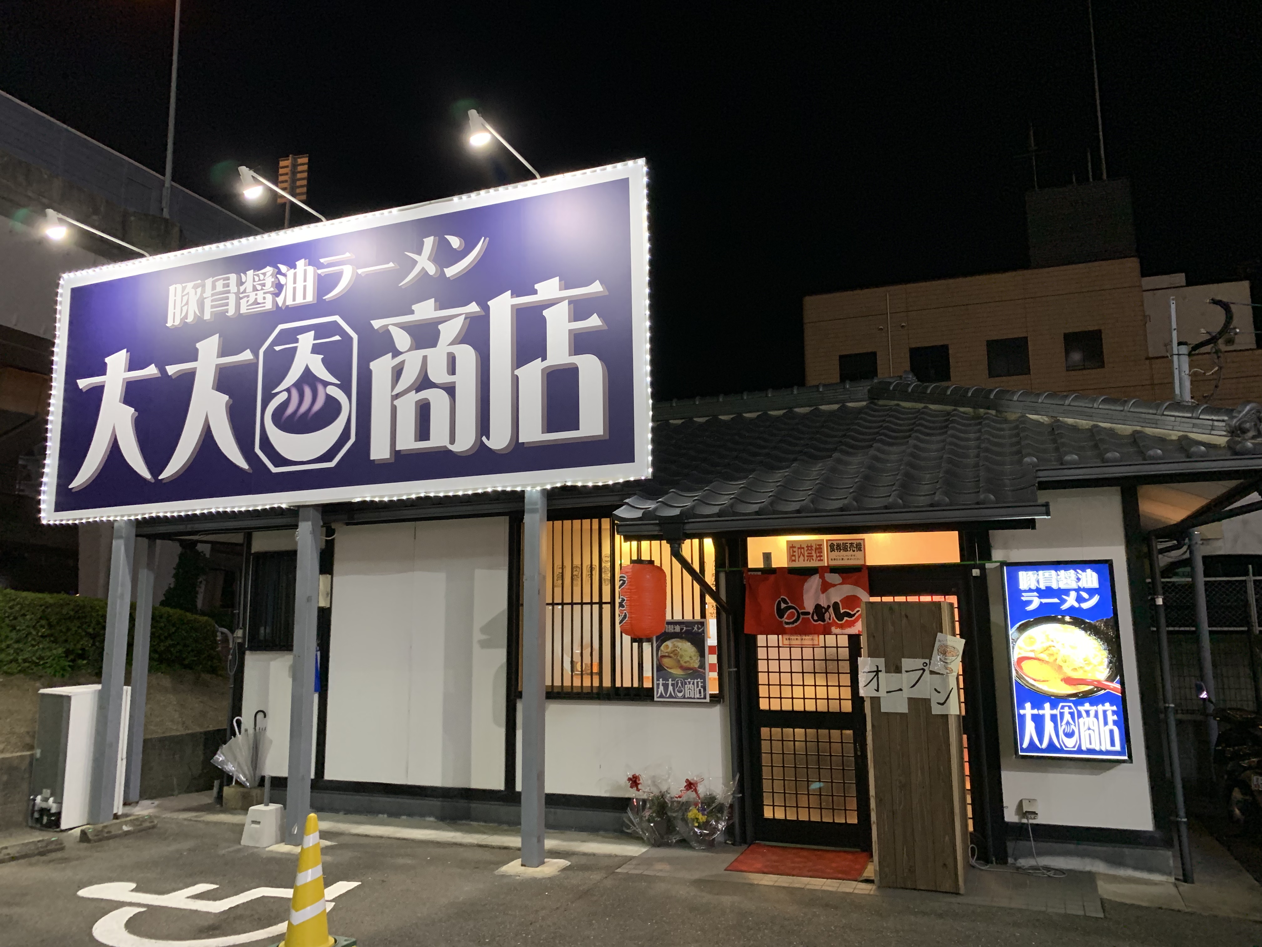 大きな看板があり、豚骨醤油ラーメン大大商店と書いてあります。