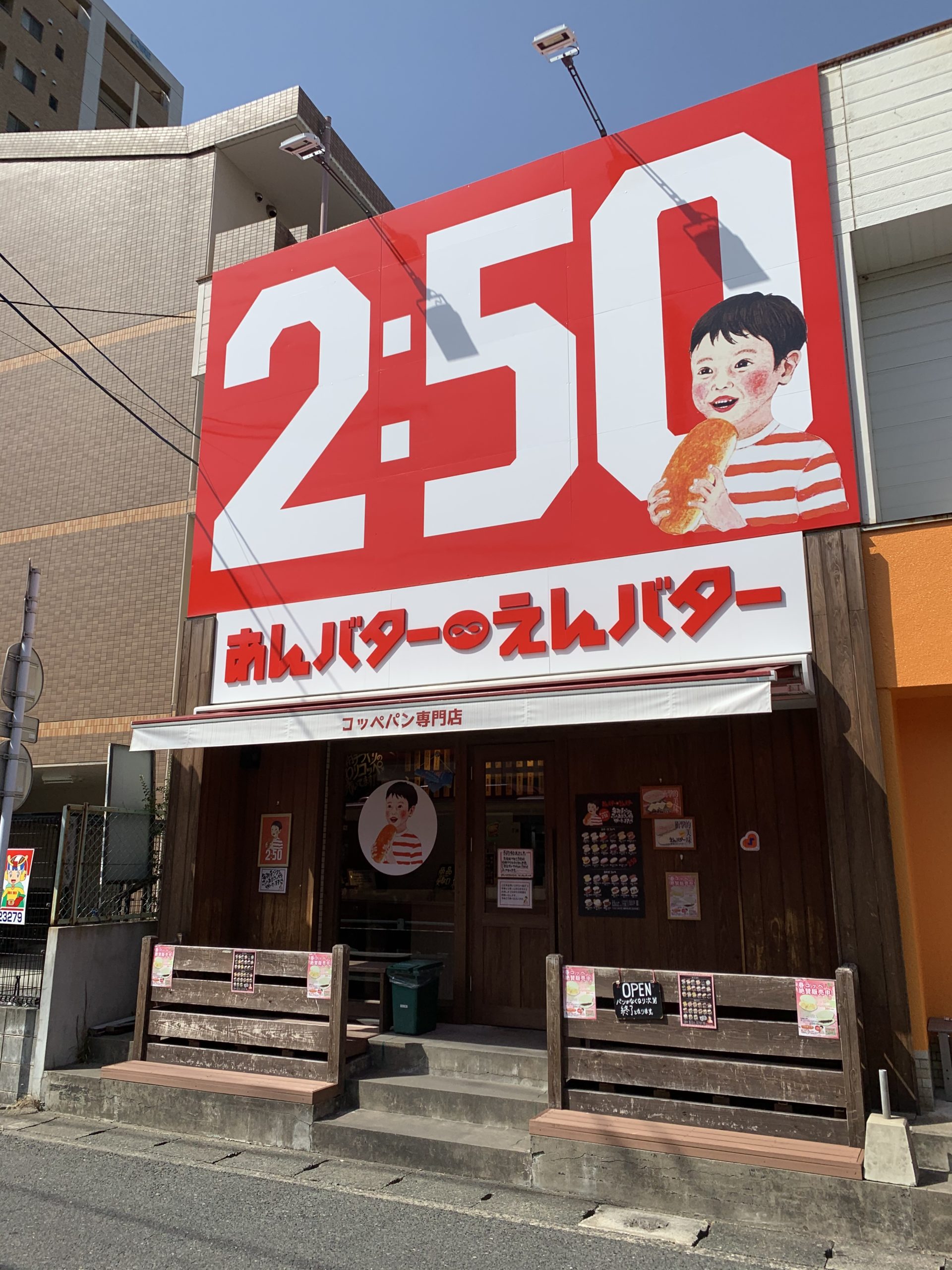 着いてみると、2:50と大きく書かれた赤と白の看板の下にあんバター∞えんバターと書いてあり、その下に小さくコッペパン専門店と書いてあります。