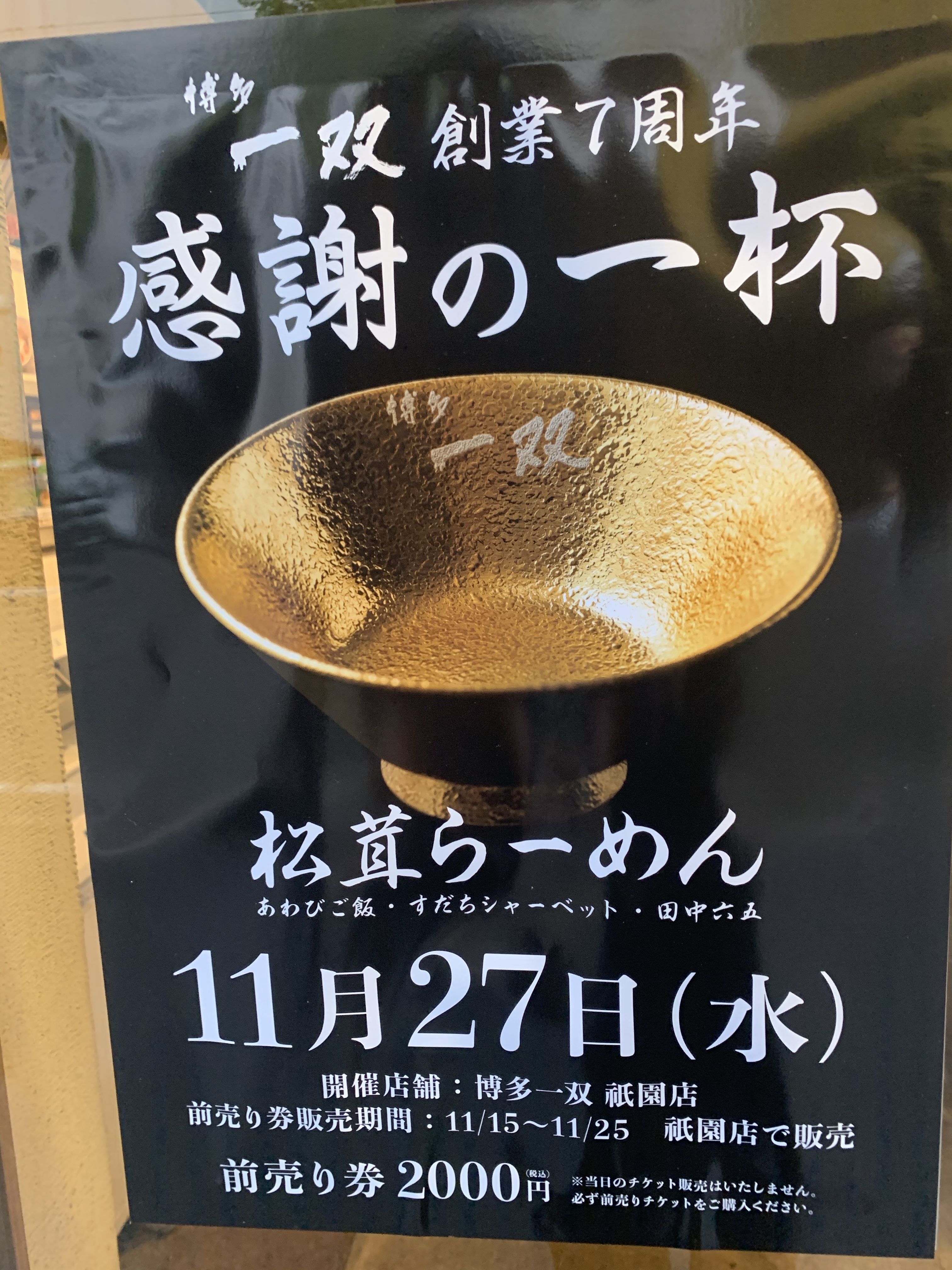 #博多一双 #創業7周年 #感謝の一杯 #イベント #祇園店 #松茸ラーメン #あわびご飯 #ゆずシャーベット #ふるまい酒 #金の丼 #金のレンゲ #福岡グルメ #麺スタグラム #ガーソー #ラーメン大好きガーソーさん #福岡市博多区祇園町 #地下鉄祇園駅 #製麺屋慶史 #gaso #hakataissou #hakata #fukuoka #gourmet #ramen