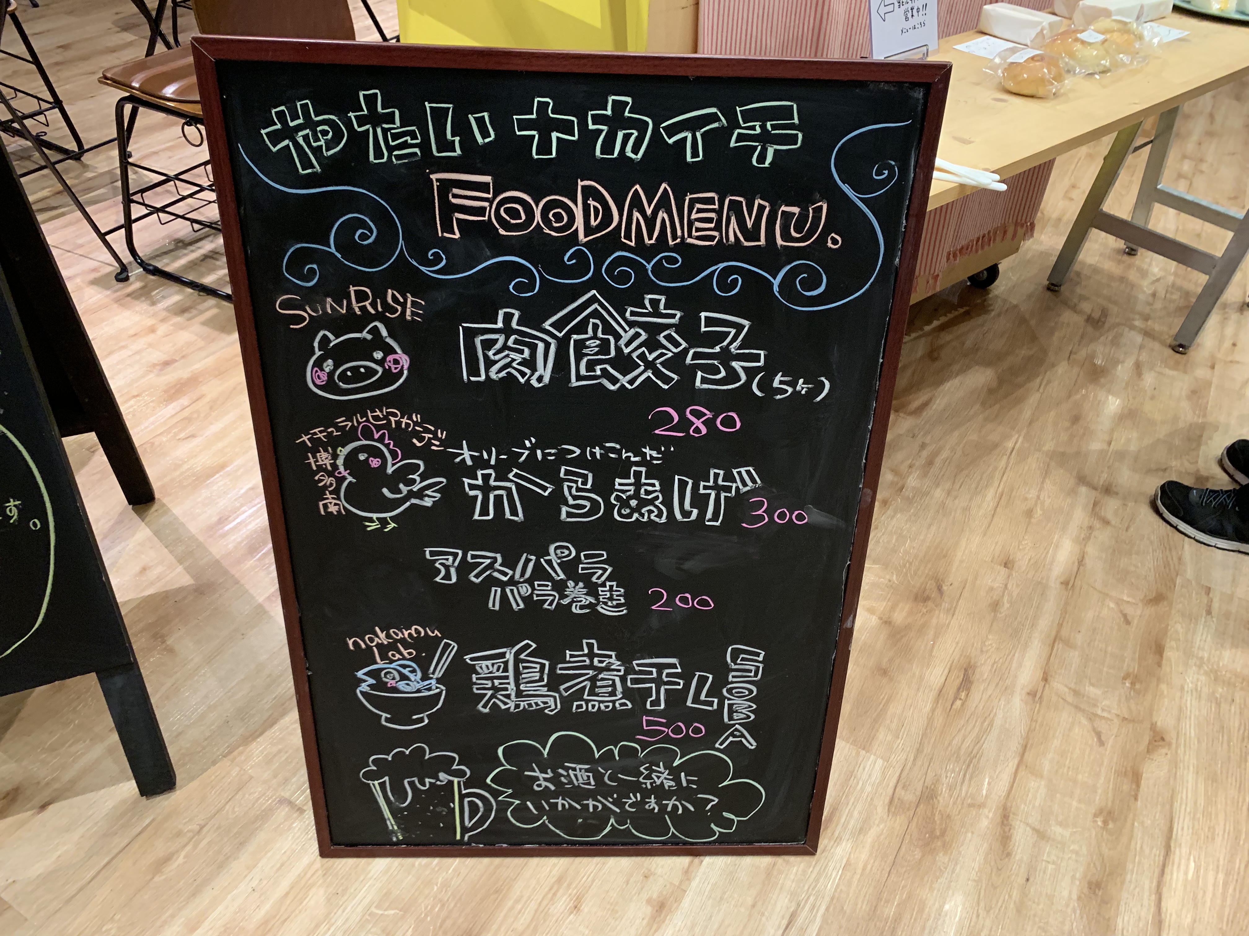どうやらハンバーガーのSUNRISEさんはお肉屋さんでもあるので、肉餃子や唐揚げ、アスパラバラ巻きなんかを担当されてて、ナカムラボさんは鶏煮干しSOBAを販売され、napanさんはサンドイッチやパン等を販売されていて、カフェるるんさんは飲み物担当って感じっぽい。
