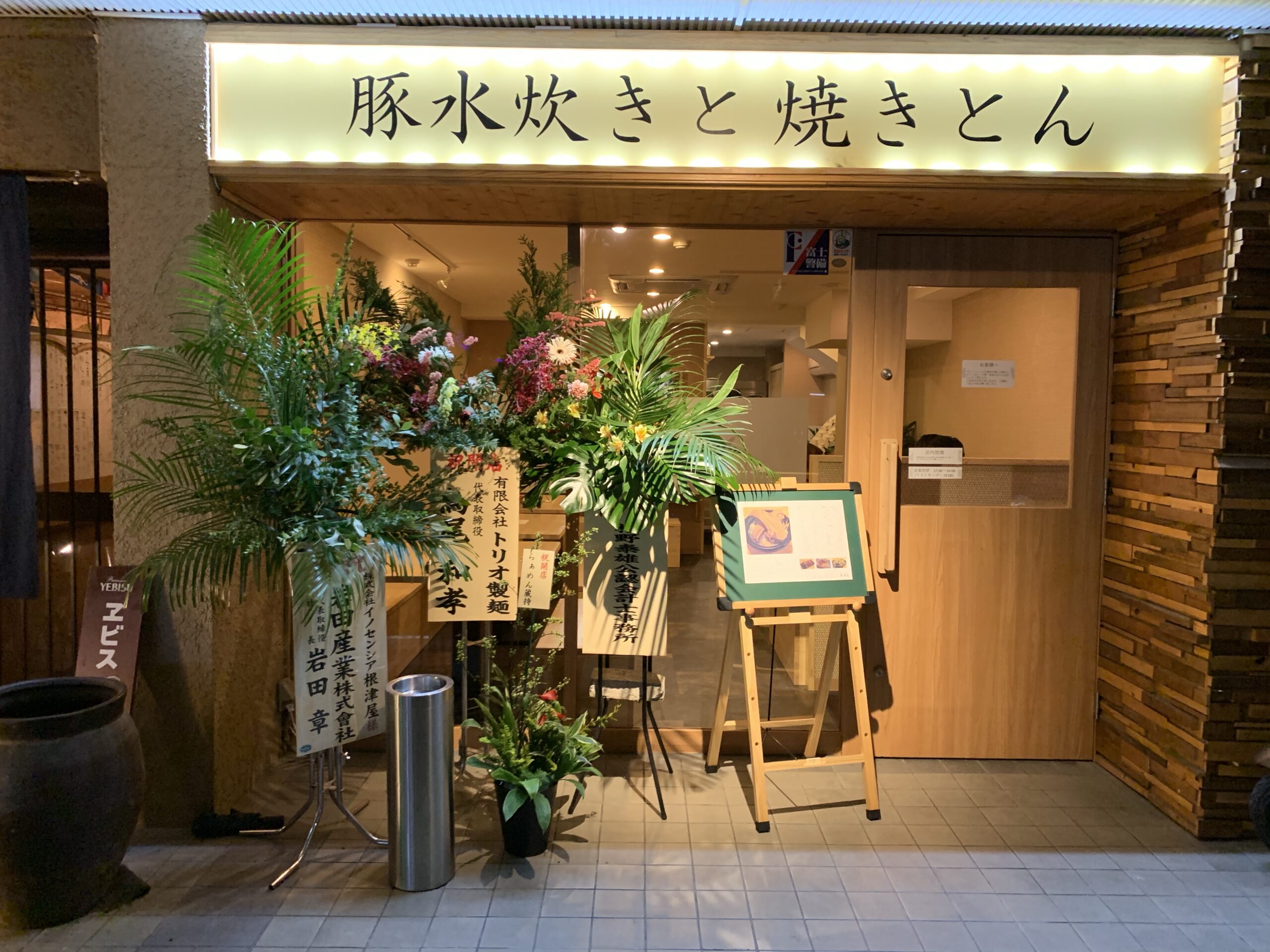 近くのコインパーキングに車を停めてお店の前に行くと、白木を基調にした雰囲気の良いお店で、大きく豚水炊きと焼きとんのお店と書いてあります。