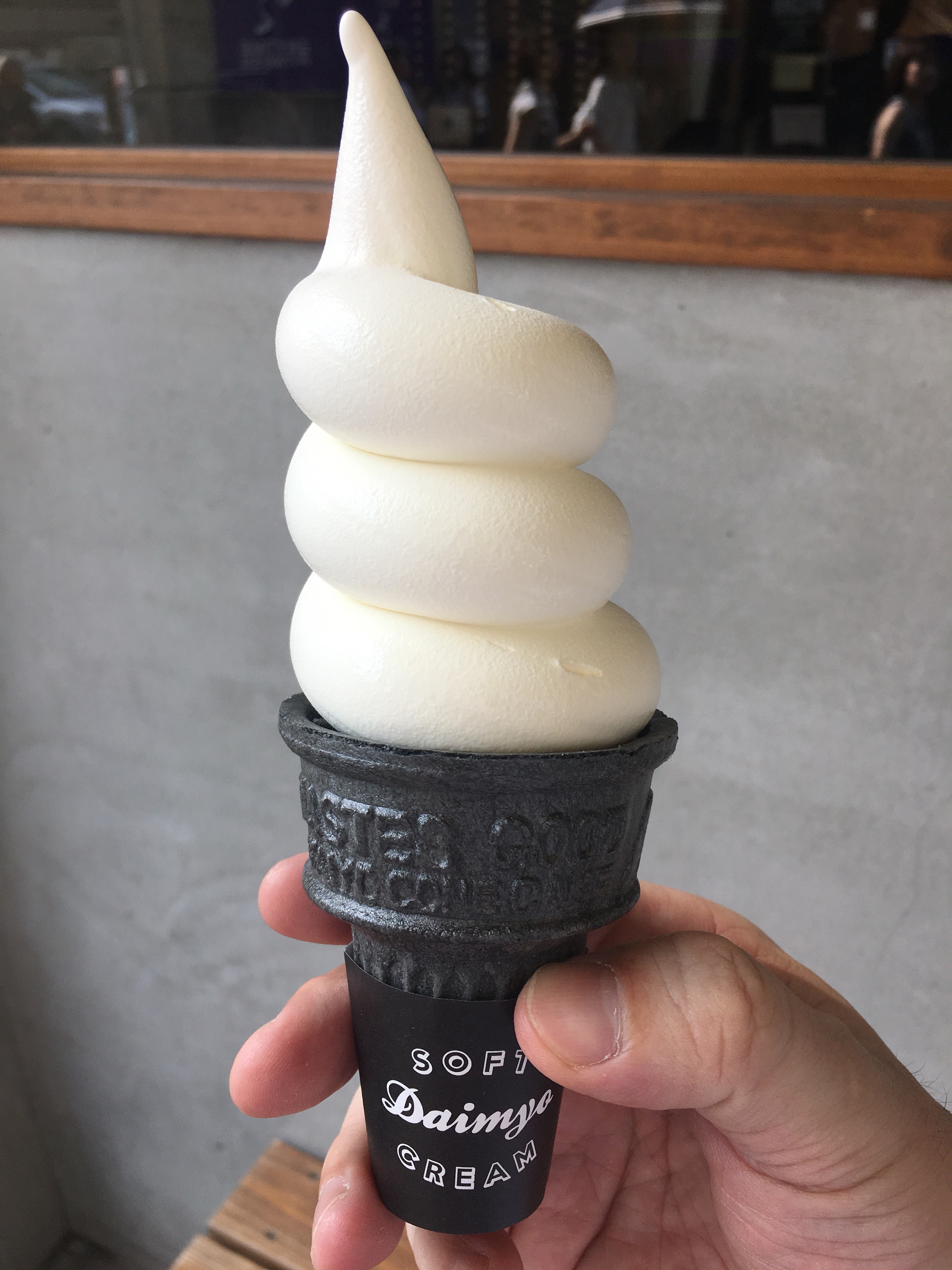 で、並んで、実は店内にも並んでたから少し待ちましたけど、さほどでもなく大名ソフトクリームの生クリームミルクソフトをゲット!