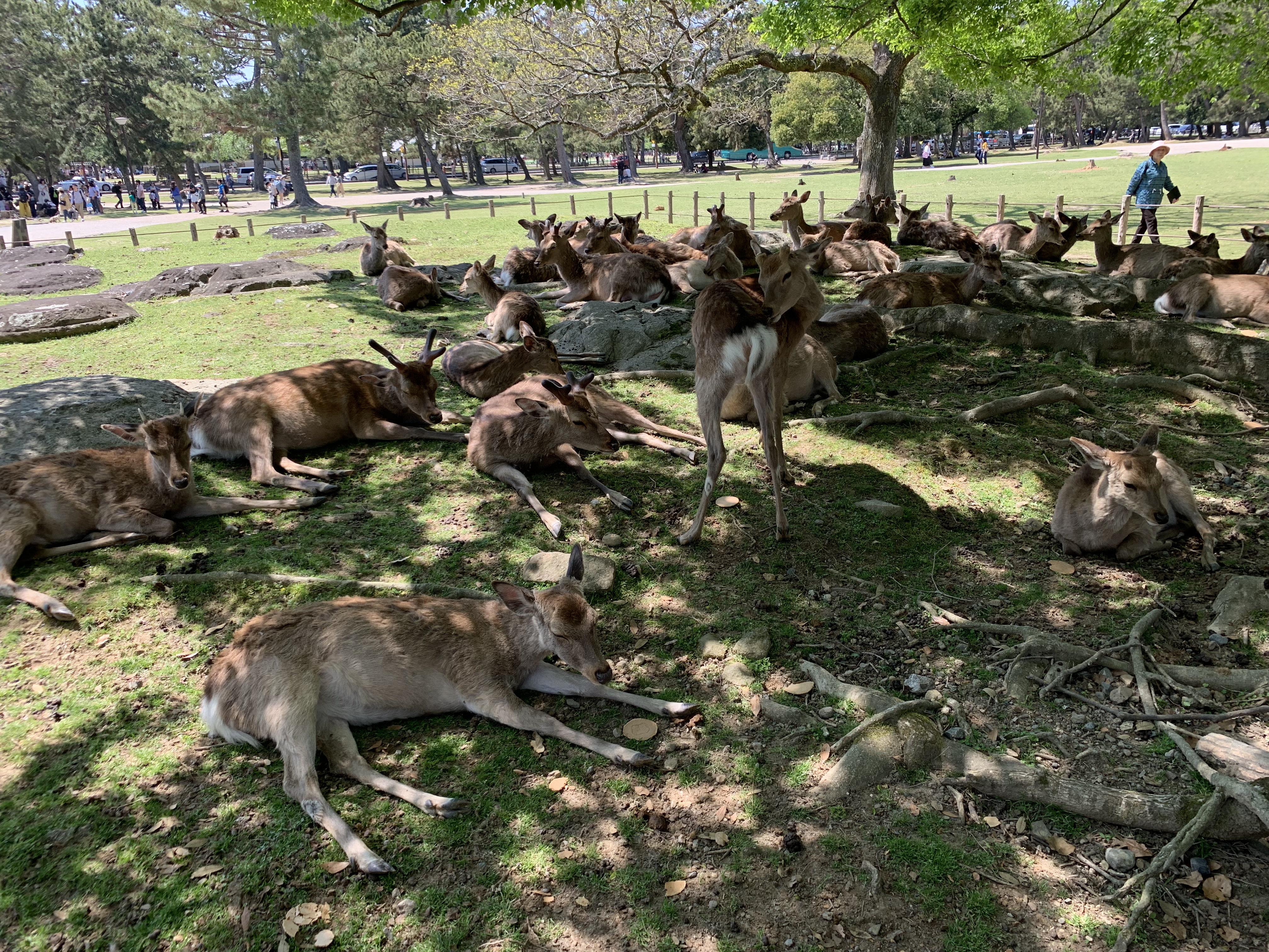 早速、鹿せんべいを150円で購入し、鹿に近づいてみましたが、GWの期間中ということで、天気はいいし、たくさんの人出ですから、鹿たちもお腹一杯かつ日陰で寝ていて、全くリアクションしてくれません(;^ω^)