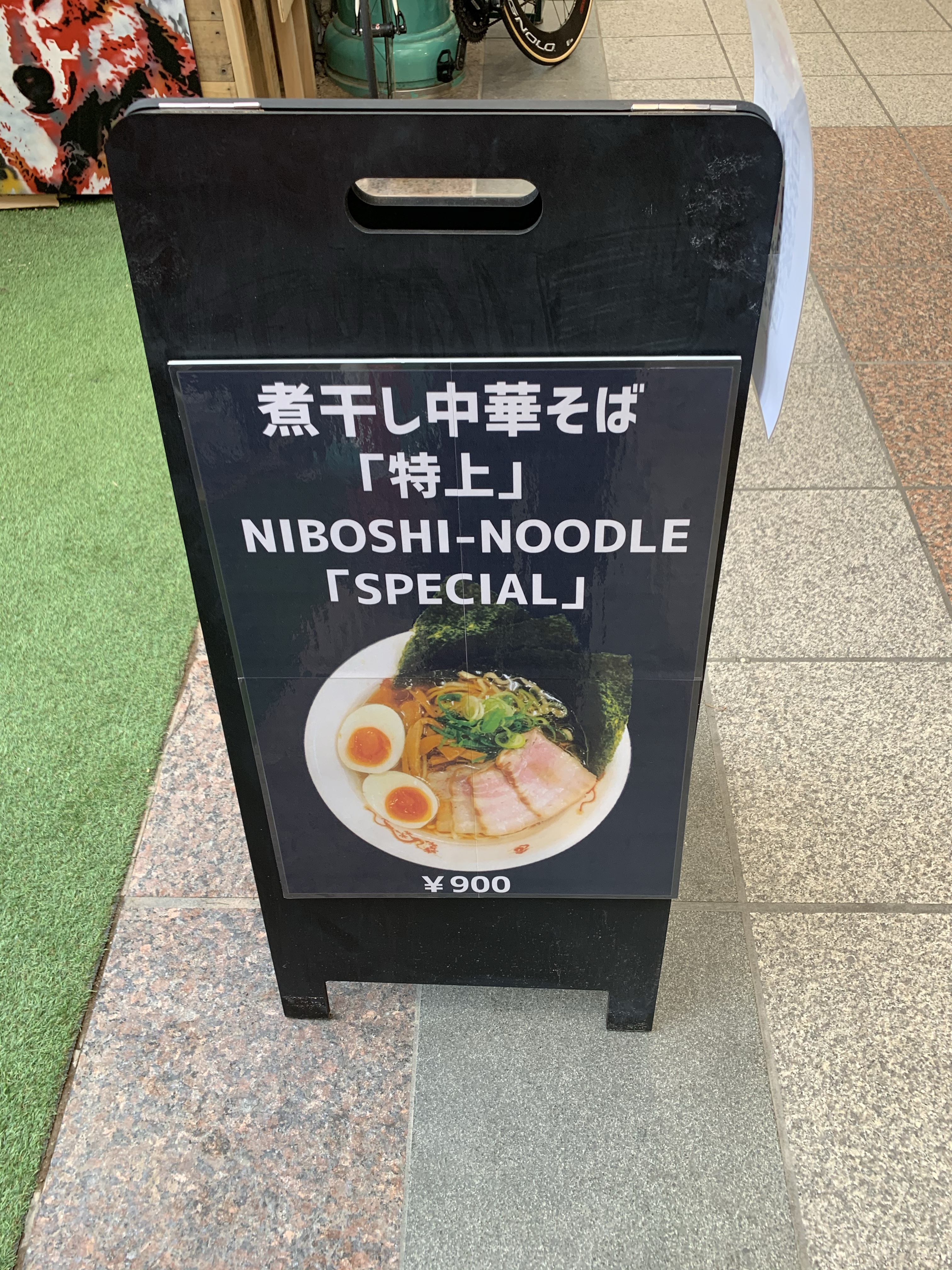 煮干し中華そばの並、上、特上とあり、普段ならノーマルしか頼まないところですけど、まあせっかくなので今回は特上を注文して900円を支払い、そのままテーブルがセッティングされていたのでそちらに座ってしばし待ちます。