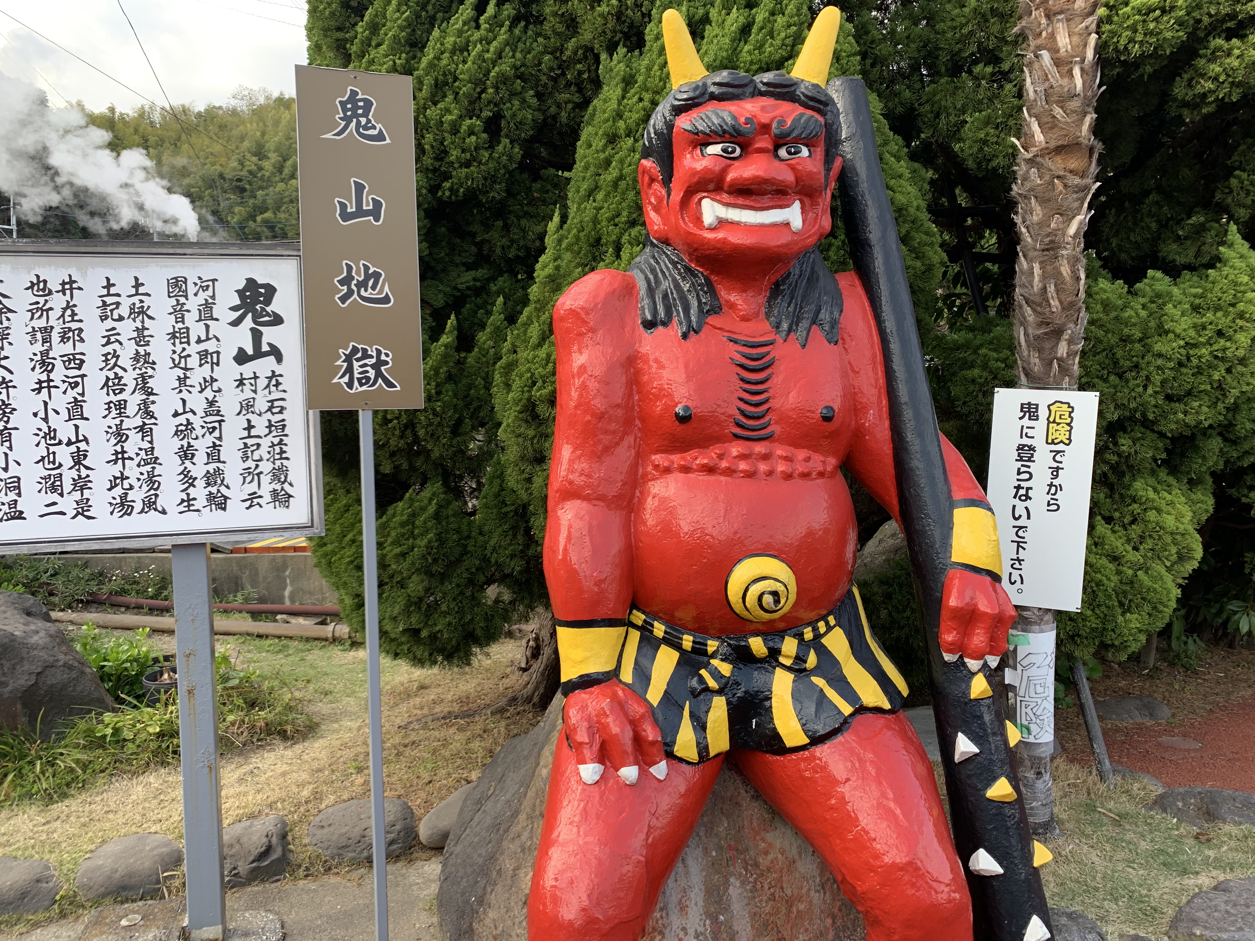 入口前の駐車場に車を停めて、それから入口で観覧料を払って園内に入り、まずは入口付近の赤鬼の前で写真を撮ります。