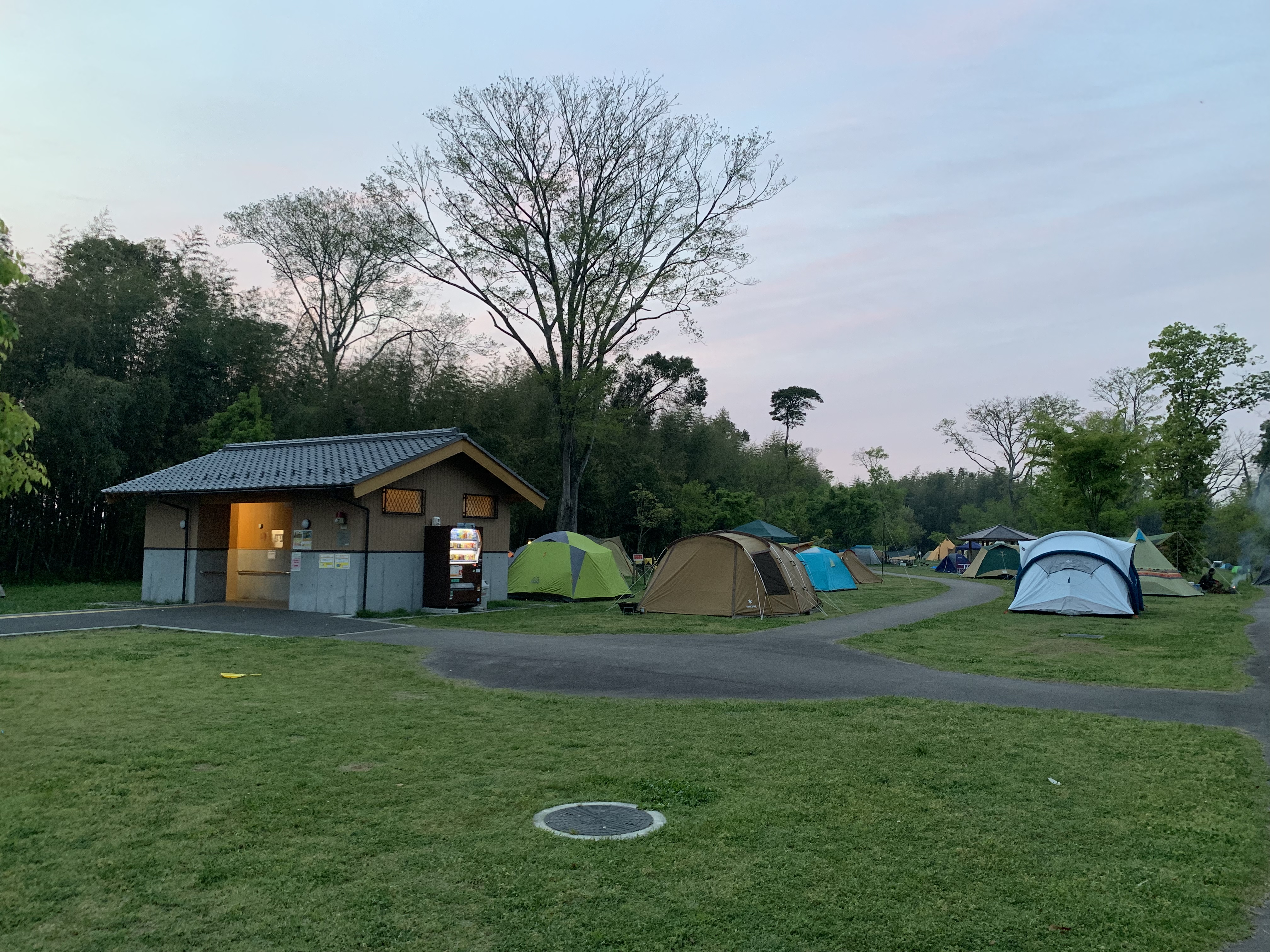 ただ、駐車場は満車でしたけど、キャンプ地自体は空きが全くないわけじゃなかったので、車を駐車場の邪魔にならないところに停めて荷物を降ろし、奥の方よりはいいかと、トイレ裏手の空いているところにテント設営。