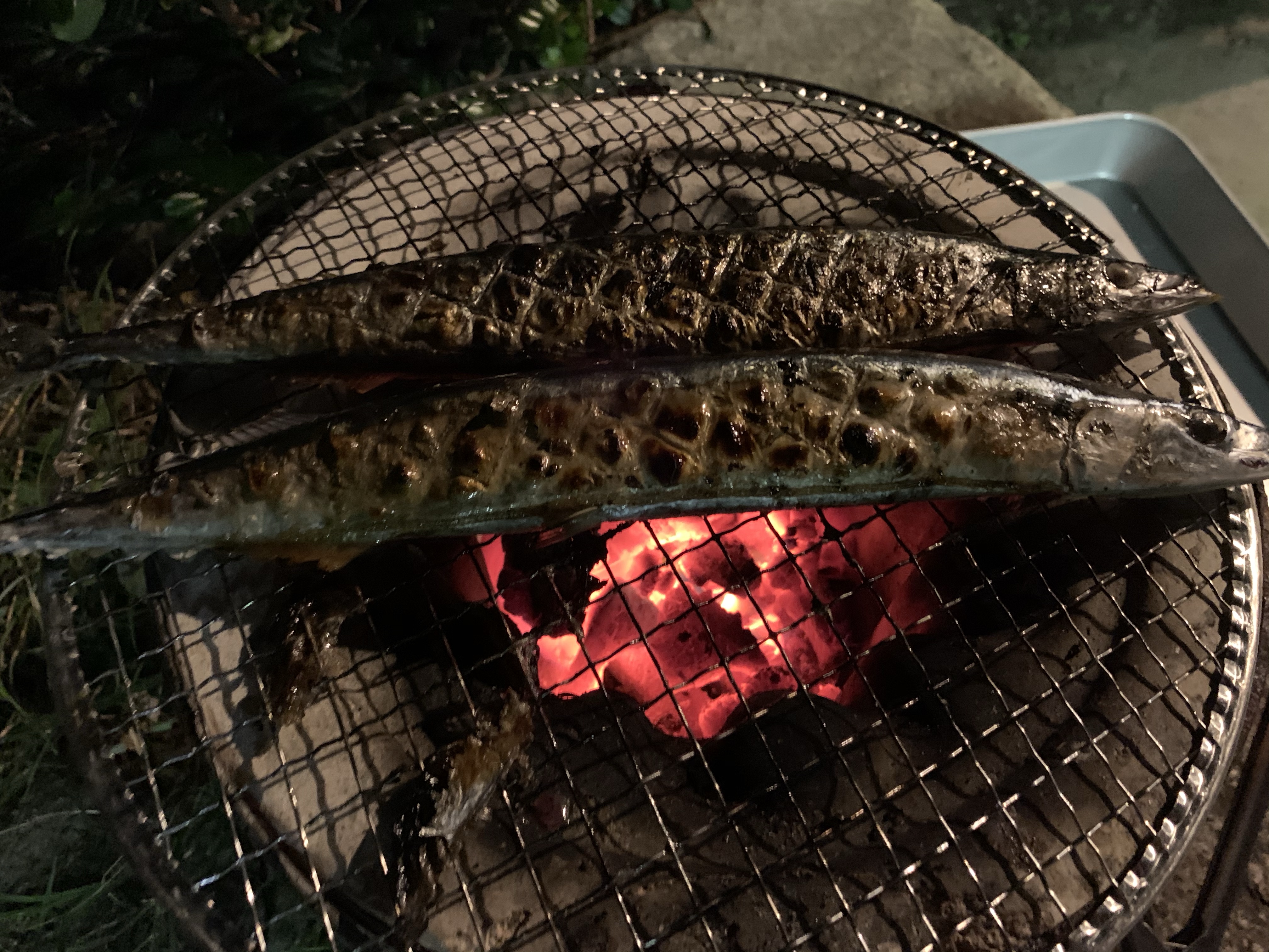 秋刀魚に塩振ったり、大根を鬼おろしにしたり、スダチを切ったり、キノコのホイル焼きを準備してトースターに放り込んだり、トウモロコシを切って、七輪だと転がりそうだからそれはフライパンで焼いたり、ナスと油揚げの味噌汁を作ったり。