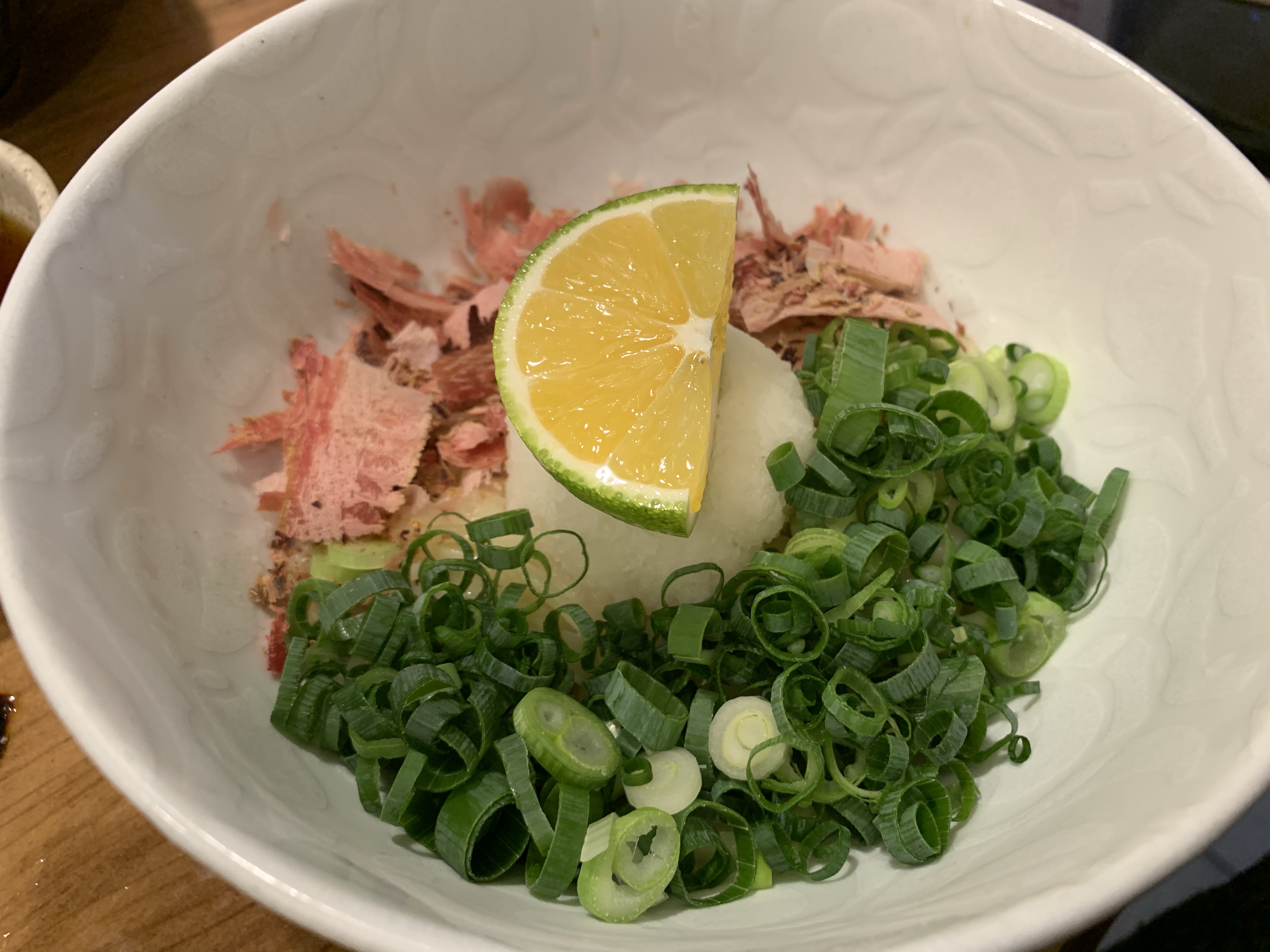 枯節とカボスぶっかけはシンブルですが本枯節の厚めに削った節が美味しく、自家製の平打ち麺と絡んでめっちゃ美味い!