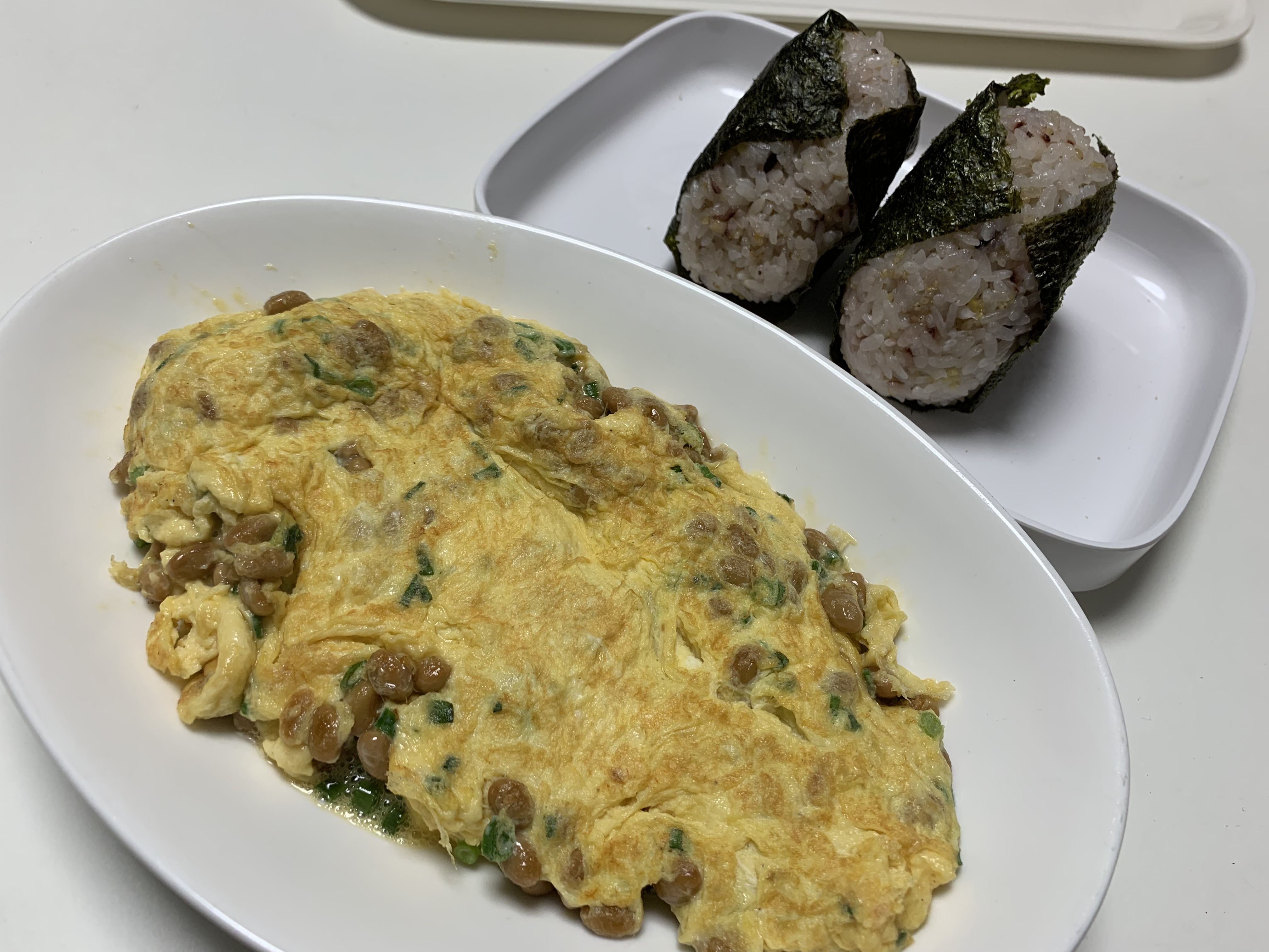 たまには冷蔵庫の整理やらで作ることもありまして、先日の夜、半端にご飯が残っていて、賞味期限切れになった納豆があったので、おにぎりを握り、納豆は納豆オムレツに。