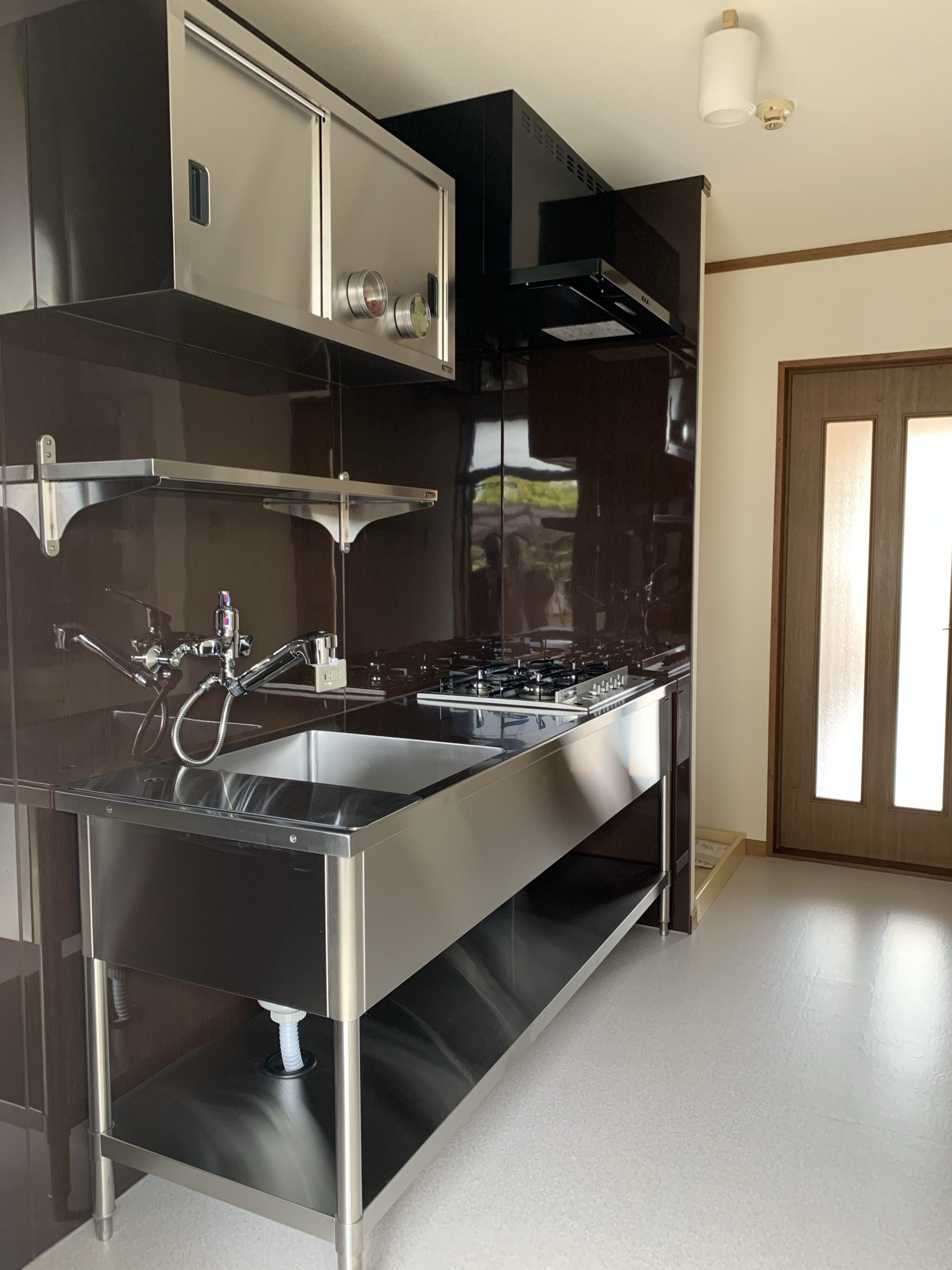 業務用の広々したシンク台を使用しており、上部にはステンレスの収納もあります。