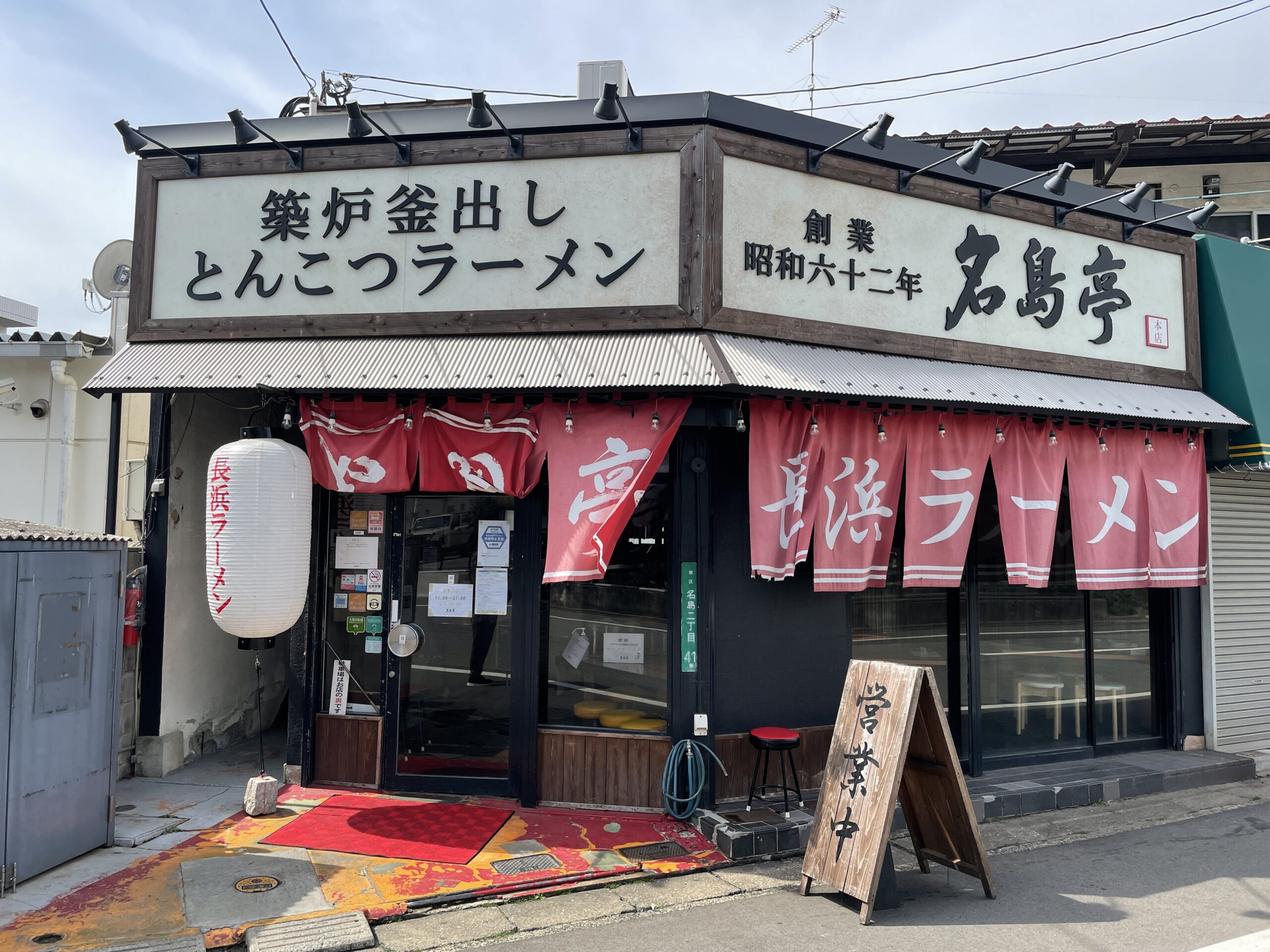 築炉釜出しとんこつラーメン、創業昭和62年名島亭と書かれた味のある店構え。