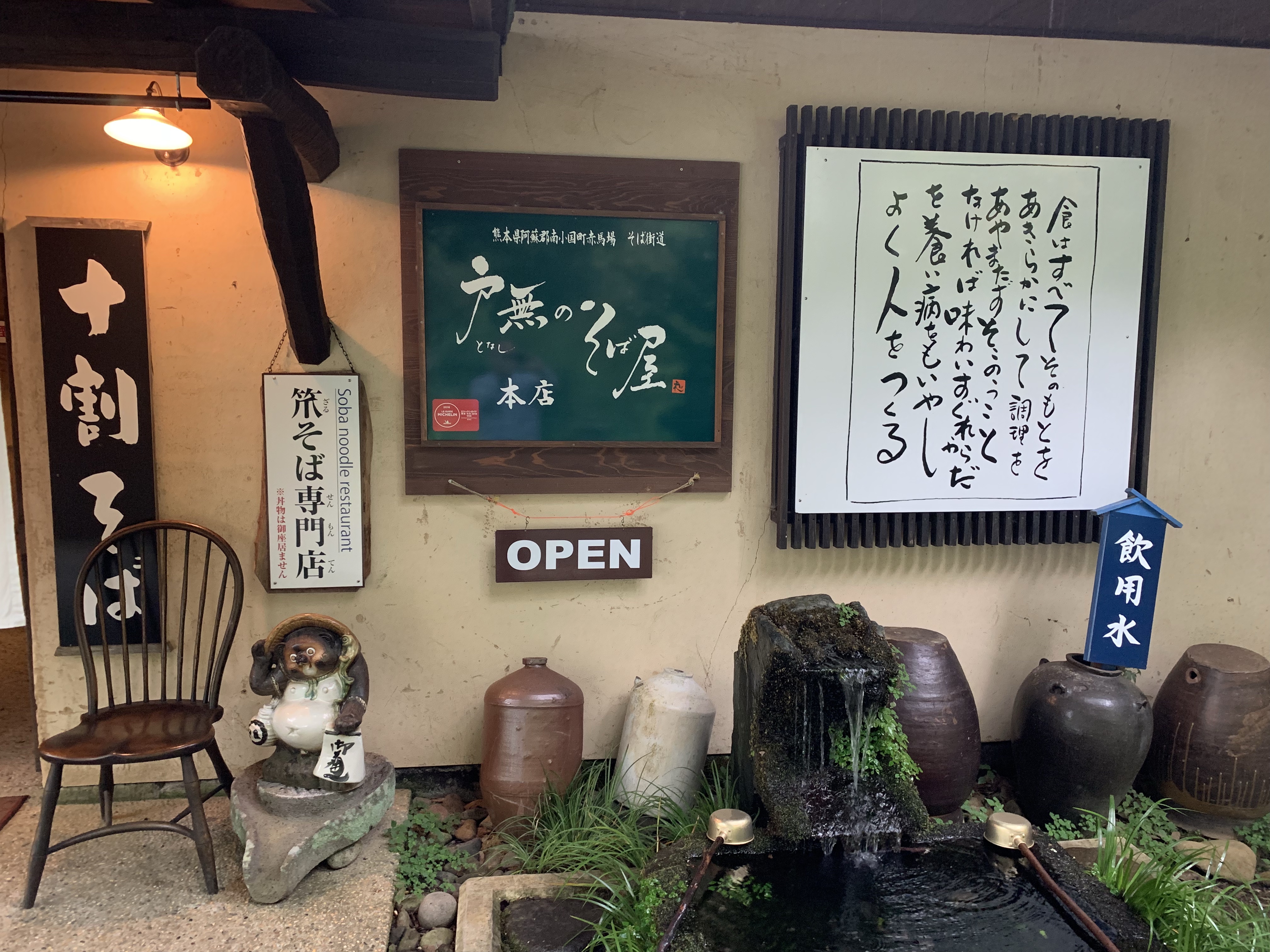 小笠原流手打蕎麦切総本家とも書かれていましたが、後から聞いたところ、山川草木と同じ小笠原さんという方がこちらも経営されていて、黒川温泉を有名にされた立役者でもあるんだそうで、その小笠原さんが作る蕎麦だからこの看板なんでしょうね。