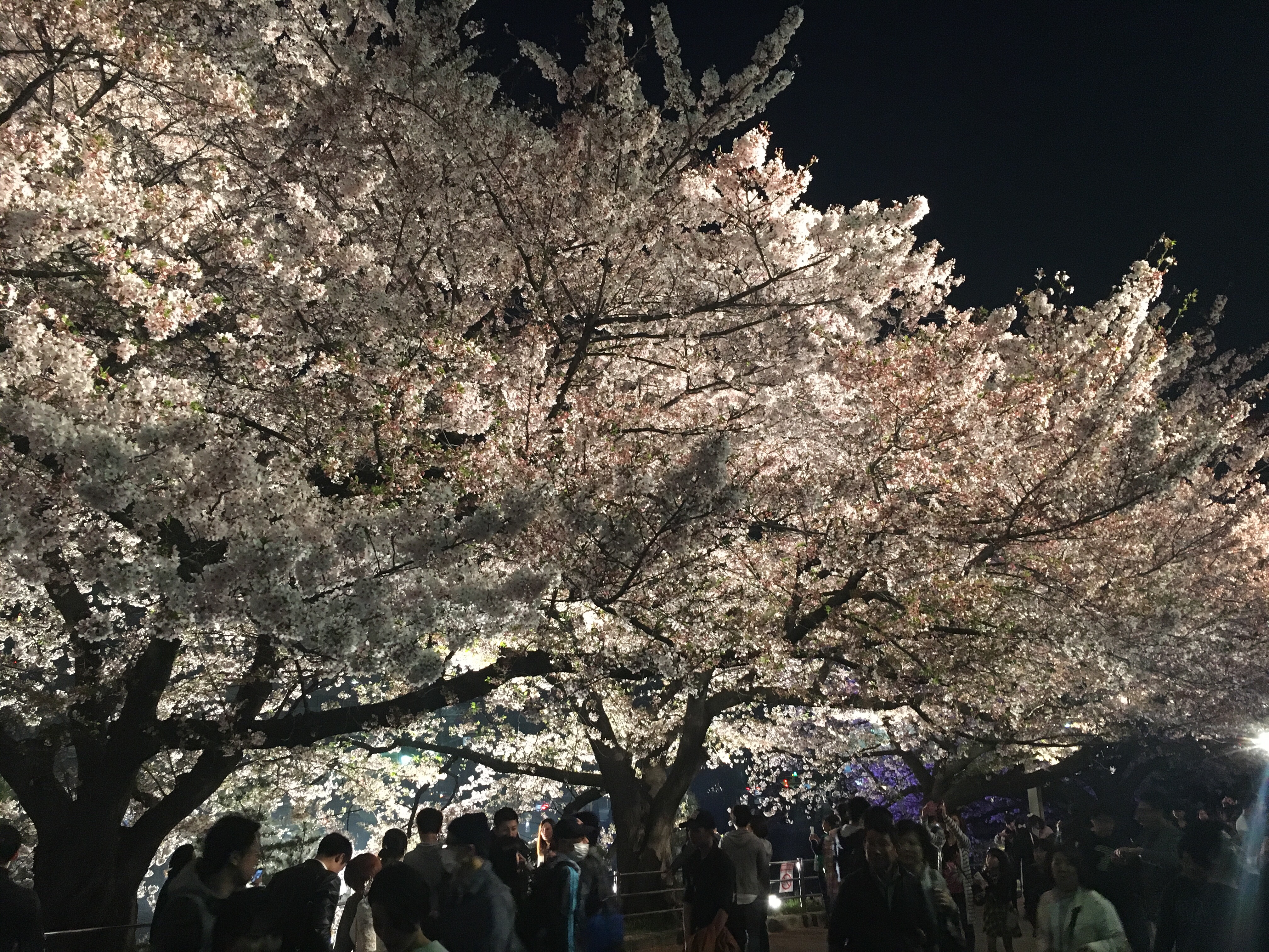 広場まで行き、ライティングされた桜を見ながらそれぞれ買ってきた物をいただきます。