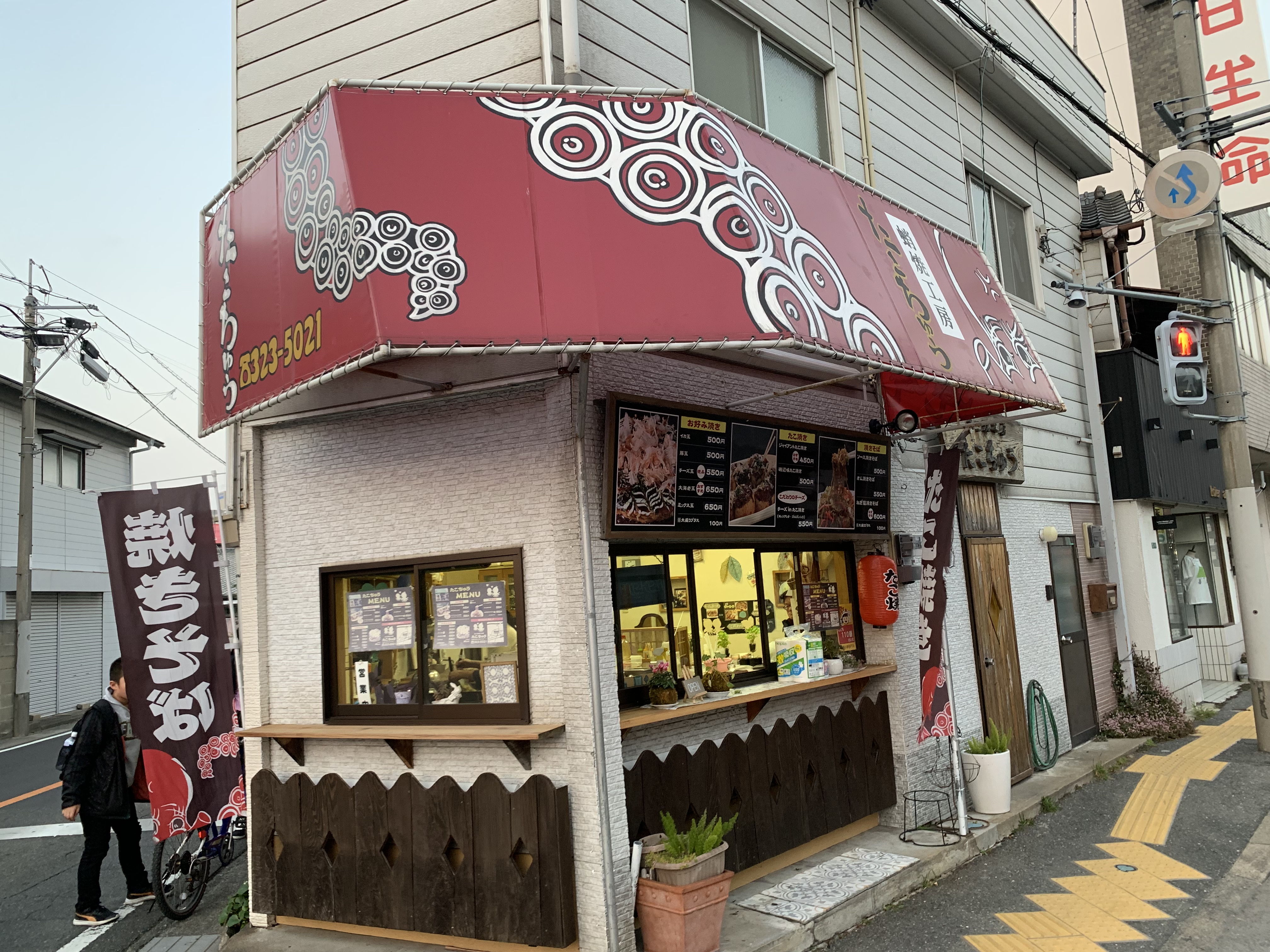 筑前前原駅の前の道を糸島市役所に向かっていく途中の踏切に曲がる道の右手前角にあるたこ焼き屋さん。