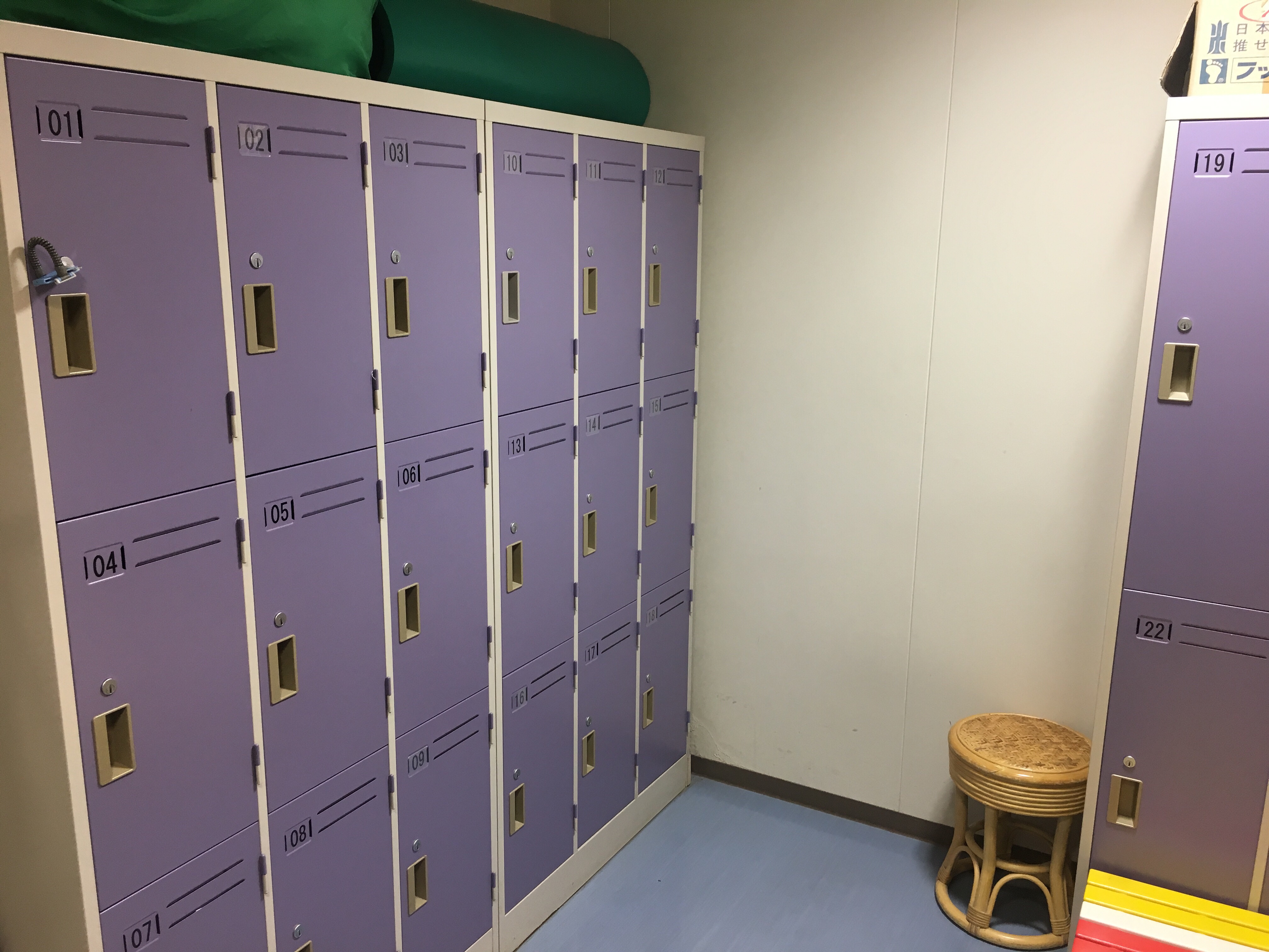 まずはリハビリ室隣接のプール入口から、靴をスリッパに履き替え、ロッカールームに。